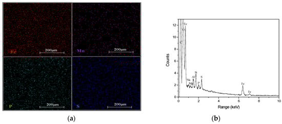 To confirm these visual observations, further examination was conducted by Energy Dispersive X-ray Spectrometry (EDS) scanning. Different colors were added to the image representing various elements. Figure 3 shows bright particles deposited on the root surfaces of Fe 500/P 0.1. In this image, Fe is represented by red, P by green, Mn by purple, and S by blue. The element of Fe was more dense than P and Mn.