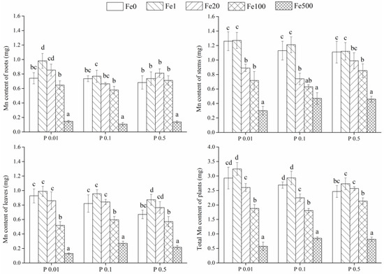 Mn content in stems was significantly higher than in roots (1.04–4.35 times) and leaves (1.03–2.31 times) (Figure 5). In contrast to Fe and P, total Mn content of Fe 0 and Fe 1 treatments at any given P level was greater than others. The total Mn content in P 0.01 of Fe 0–Fe 20 was higher than P 0.1 and P 0.5 treatments, and higher in the Fe 100/P 0.5 and Fe 500/P 0.1 treatments. Plants grown in the Fe 500 treatment had the lowest total Mn content (23.1%–41.1% of other treatments).