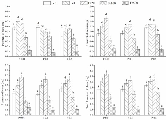 Stems (1.6–3.7 times) and leaves (1.4–2.9 times) had greater P content than roots for the same treatments (Figure 6). P content in each tissue type increased with Fe2+ addition until Fe 100 and Fe 500 treatments, which showed a downward trend. The total P content of P 0.01 treatment was higher than the other P levels except the Fe 0 treatment. Among five Fe concentrations at a given P level, total P content of Fe 1 was greater and greatest in the Fe 20 treatments.