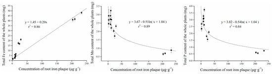 Relationship between the concentration of root iron plaque and total Fe content, total P content, and total Mn content of the whole plant. Data were means ± SE (n = 3).
