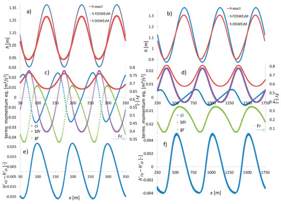 According to Equations (7) and (8), fixing the values of uh and n, the sharpest profiles of zb, h and H are obtained for the shortest channel (shortening L from 2500 to 500 m, we reduce by the same factor both the channel and the wave lengths in Equation (7)). This test was presented in [47], where the authors apply their zero-convective inertia model, which becomes a 0ISWEsM for steady flow. They analyze separately the effects of L and Fr on the scatters between the solution of their 0ISWEsM model and the fully dynamic one (Figures 7 and 8 and related comments in [47]). They do not investigate the role of the terms in the momentum equations and do not quantify the value of the inertial term compared to the other terms in the momentum equation of the fully dynamic model.