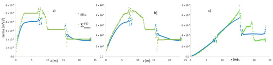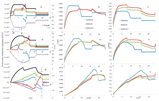 In Figure 1, top, we compare the exact solution (Equation (7)) with the numerical ones, computed over the unstructured mesh, for cases 1 (left) and 2 (right). In Figure 1, center, we show the terms of the momentum equation of the FDSWEsM and, on the secondary scale, the Fr computed by the same solver. In Figure 1, bottom, we plot the differences (dh/dx)FD–(dh/dx)0I. We observe that (1) the maximum absolute values of the ci term correspond to the maximum scatters between the dh/dx computed by the two solvers, and (2) similar values of dh/dx are computed by the two solvers also for significant values of Fr.