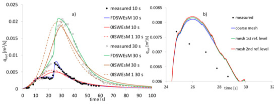 We plot in Figure 4a the measured and computed qout. The FDSWEsM matches reasonably well the measures for both tests. The 0ISWEsM fails in simulating the profile of qout for the shortest rain duration, and anticipates the discharge for the rain duration of 30 s.