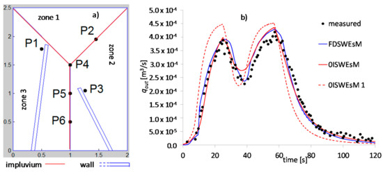 In this section we investigate how the proposed FDSWEsM and 0ISWEsM simulate the application of a rainfall over a laboratory catchment. We consider the rectangular domain 2 m × 2.5 m of the experiments presented in [53] (see Figure 5a). The bottom is impervious, made of three stainless-steel planes with slope 0.05, referred to as zones 1, 2, and 3, respectively (in Figure 5a). The authors suggest a value for n equal to 0.009 s/m1/3, consistent with the material of the bottom, referred to as n0. The configuration of the bottom slope generates one impluvium between zones 2 and 3 and two impluviums, between zones 1 and 2 and zones 1 and 3, respectively. This simple geometry was complicated by the authors in [53] placing two walls inside the basin (in Figure 5a). We discretize the domain with a GD mesh with 14,735 triangles and 7647 nodes (the mean area of the triangles is 3.1d–04 m2). The gauges P1, ..., P6 in Figure 5a, have been used for the comparison of the results predicted by the two models.