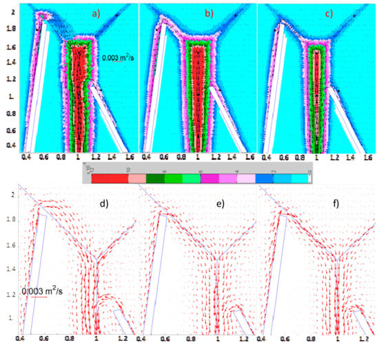 Test 3. (a) computed h and vectors of unitary flow rate, FDSWEsM; (b,c) the same for the 0ISWEsM and 0ISWEsM 1, respectively; (d) zoom of the vectors of the flow rate, FDSWEsM; (e,f) the same for the 0ISWEsM and 0ISWEsM 1, respectively. T = 52 s.