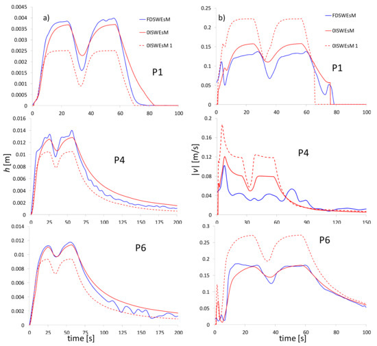 In Figure 7 we plot the time evolution of the water depths and modulus of the velocity computed by the two solvers at some of the gauges in Figure 5a. We compare the modulus of the flow velocity, since the components simulated by the 0ISWEsM, 0ISWEsM 1 and FDSWEsM have the same sign. The plotted time evolutions confirm that the 0ISWEsM 1, generally, under predicts the water depths and computes a faster flow field, compared to the FDSWEsM. As expected, these differences are significantly reduced if we adopt the nopt value for the simulations of the 0ISWEsM.