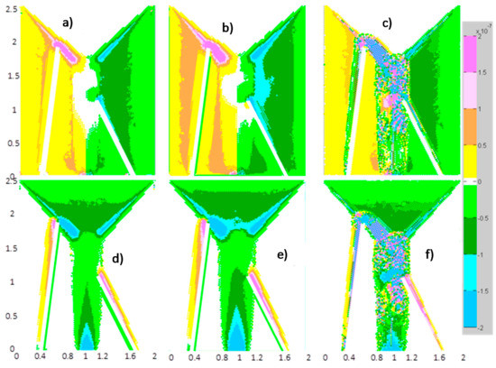 Even if the FDSWEsM computes subcritical flow in the entire domain, with values of Fr ranging from 0.00051 to 0.32, some discrepancies in the results of the two solvers can be observed inside the domain. Figure 6a–c shows the water depths and the unitary flow rate vectors computed by the two models at 52 s and Figure 6d–f shows a zoom of the flow field near the walls at the same simulation time. In Figure S5 (in Part B in Supplementary Materials) we also show the results computed at 22 and 30 s, before and after the first stop of the rain, respectively. Generally, the 0ISWEsM and 0ISWEsM 1 predict smaller values of h along the impluvium between zones 2 and 3, and the highest differences in the values of the water depths predicted by the two solvers arise at the end of the two walls, where strong differences of the computed flow rate vectors can also be observed. Due to the lack of the inertial terms, the flow rate vectors given by the 0ISWEsM and 0ISWEsM 1 bend immediately at the end of the walls to the center of the domain, unlike the vectors of the FDSWEsM, which continue parallel to the wall for 0.05–0.1 m.