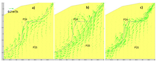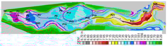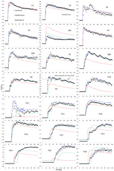The values of nopt at the gauges P9 and P12 are very similar (Table 5 (right)). The maximum water level simulated at P9 with nopt reaches the top of the levee (see Figure 16), but the overtopping occurs in a downstream portion of the levee, close to the intake of the reservoir, where the topographic level is smaller. The different position of the overtopping is also confirmed by the time delay of the arrival of the front at gauge P12, compared to the measured one (see Figure 16). The overtopping of the reservoir does not occur for values of the Manning coefficient smaller than the nopt value of gauge P9. The values of nopt at gauges P23–P26 are significantly smaller than the one at gauge P9. This confirms that the overtopping/not overtopping is not the only one factor determining the dynamic of the wave propagation in the downstream portion of the domain.
