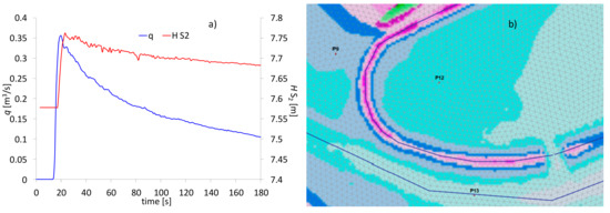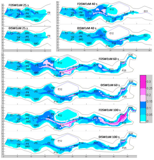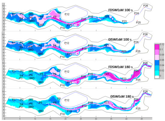 The FDSWEsM computes subcritical flow everywhere in the domain (with values of Fr ranging from 0.0001 to 0.34). The 0ISWEsM generally underestimates the extent of the flooded areas and the values of the water depth, especially upstream of the reservoir, in front of the intake of the reservoir and close to gauges P24–P25. The two solvers do not simulate the overtopping of the central reservoir, but, as for the previous scenario, the dynamics of the wave propagation downstream of the reservoir is not exclusively governed by its overtopping.
