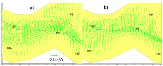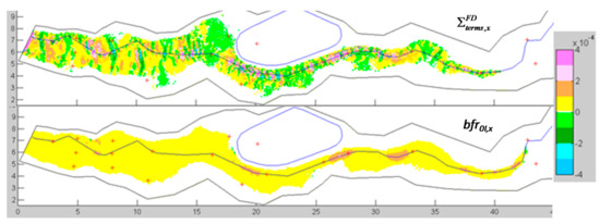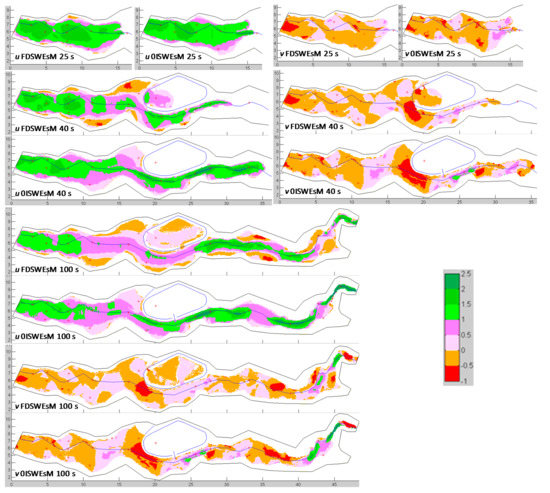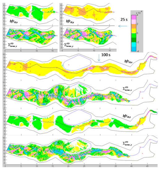 The wave predicted by the zero-inertia model propagates faster than the one of the FDSWEsM (see the position of the wavefront at 100 s). This is also confirmed by the values of the components of the flow velocity, not shown for brevity. In several portions of the valley, the absolute value of is greater than bfr0I, (see Figure 20, where for brevity we only plot the x components of these terms) and, as explained as above, we could explain the higher values of the flow velocity predicted by the 0ISWEsM. For this scenario we computed the values of the nopt for the 0ISWEsM which minimize the scatters (in terms of the L2 norms of the relative errors) with respect to the results of the FDSWEsM. For some of the gauges we obtain nopt values quite different from the imposed one (0.03 s/m1/3). For instance, the nopt values for gauges S6S, P9, P24, P25, and P26 are 0.019, 0.033, 0.035, 0.039, and 0.034 s/m1/3, respectively.