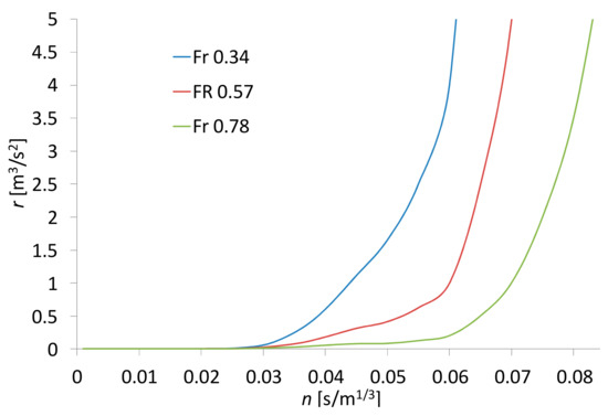 The high discrepancies in the numerical results in the profiles of h and u computed by the two models at the first simulation times (see Figure 2b,c,e,f,h,i), gradually reduce increasing the simulation times. The values of the flow velocity computed by the 0ISWEsM before the end of the rain are significantly higher than the corresponding values computed by the other solver. This could be motivated if we compare the sum of the terms (bfr + ci + li) given by the FDSWEsM and the bfr term provided by the 0ISWEsM, plotted in Figure 3. In the following in the paper these quantities are referred to as “” and “bfr0I”, respectively. Before the end of the rain, in the upstream portion of the domain, is significantly higher than bfr0I. We could regard the FDSWEsM as a 0ISWEsM with an “augmented” bottom resistance, due to the effects of the two inertias which decelerate the flow. After the end of the rain (e.g., at 20 s), and bfr0I have similar values, and this is consistent with the balancing of the inertial terms, which assume opposite sign and similar absolute values, observed as above. When the effects of the inertial terms become negligible, the two solvers have similar behavior irrespective of the value of Fr.
