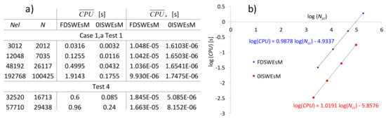 where Ncc is the number of computational cells (triangles or nodes in FDSWEsM or 0ISWEsM, respectively). In Figure 21 we plot the laws in Equation (11) required for the solution of the FDSWEsM and 0ISWEsM for test 1, case 1, and the grow with Ncc is only a bit more than linearly in the 0ISWEsM (β = 1.019) and a bit less than linearly in the FDSWEsM (β = 0.987). The is almost constant with the growth of Ncc, for both solvers (see the values in the table in Figure 21). The reason is motivated in the reference papers [9,40,41] for the 0ISWEsM and FDSWEsM, respectively.