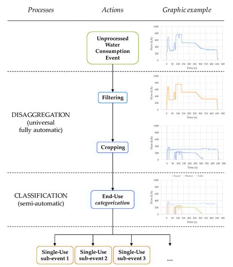 The methodology proposed is divided into two processes (Figure 1). The first one, disaggregation, works on the original, and generally overlapped, consumption events in an iterative way until all the resulting subevents are either single-use (the most) or uncertain (a few) events (examples in Appendix A). By means of this methodology, the resulting subevents are more homogenous than the ones obtained by manual processing of flow traces through, for example, BuntBrainForEndUses®. This software application follows the same analysis procedure and allows human analysts to graphically crop water consumption flow traces into its various individual components.