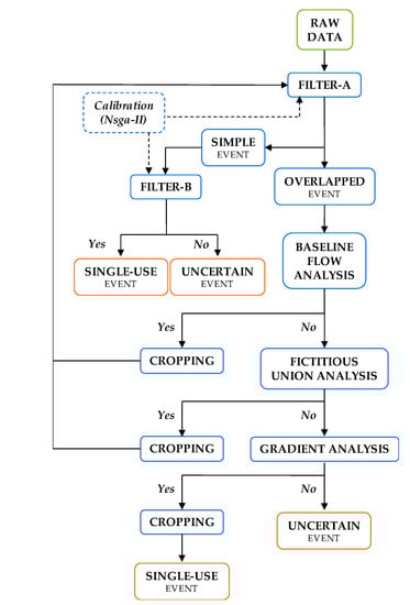 The proposed disaggregation process focuses on an advanced two-stage filtering based on the algorithm described in Pastor et al. [21], which is calibrated using the Elitist Non-Dominated Sorting Genetic Algorithm NSGA-II [22], and a new cropping algorithm having as input the filtered water consumption flow traces.
