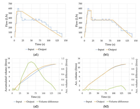 (3) the curve of accumulated volume difference is defined for those components of twi greater than 0.001 s (all flow rate jumps that take place in the raw water flow trace have this duration, as it can be seen in Figure 3(a1), Input) as follows:
