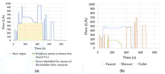 It should be highlighted as an important contribution of the proposed methodology that all previous separation processes are implemented on the raw flow trace. Thus, signal smoothing in the filtered flow trace do not generate any loss of information in the resulting subevents obtained. This particular feature can be clearly observed in Figure 5, where the separated consumption events (Figure 5b) maintain the details of the original flow trace (Figure 5a). The presence of these details can be used in a later stage to improve the effectiveness of the automatic classification tools that can be developed.