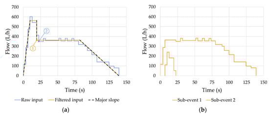 Finally, if the event does not fall into any of the previous categories, a gradient analysis of the filtered flow trace is carried out (Figure 2). Only in case that the event has three major slopes, being the first one positive and other two negative or vice versa, it is considered that it is constituted by two or more different events that are overlapped in time, which begin or end within the same time range (Figure 5a). In this case, the events are cropped (Figure 5b), and the two new events are classified as single-use events. On the contrary, if the number of major slopes in the event is greater than three, it is directly categorized as an uncertain event. The key aspect of this separation process is to correctly identify the start or the end, depending on the case, of the second major slope on the raw flow trace (Figure 5a, point 2) and the flow rate at the analogous instant in the filtered flow trace (Figure 5a, point 1).