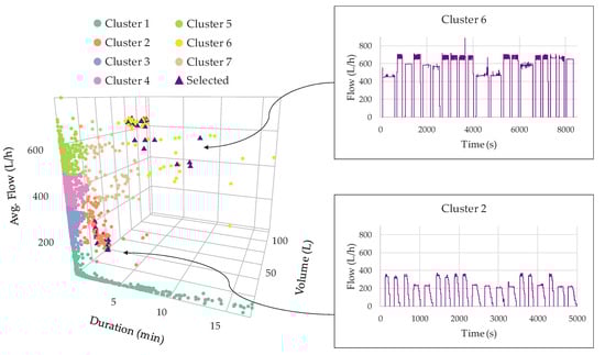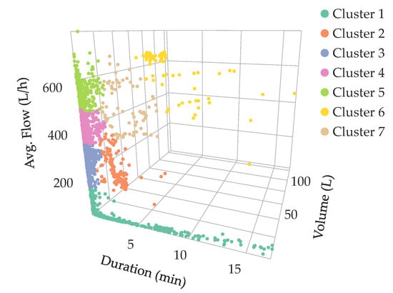 After the disaggregation process, single-use events could be categorized by clustering analysis or any other classification algorithm [15]. Similar methodologies have already been used in other fields, like non-intrusive electric load data disaggregation [26,27,28,29]. As an example of the results that can be achieved by these techniques, Figure 10 shows the findings for one of the most complex households, HH-06 of R1, showing an indoor leak and a high average daily consumption. The unsupervised learning technique used, allows to identify different types of water consumption uses: Cluster 2 in Figure 10 mostly includes events corresponding to toilets, while Cluster 6 is composed of washing machine and shower events.