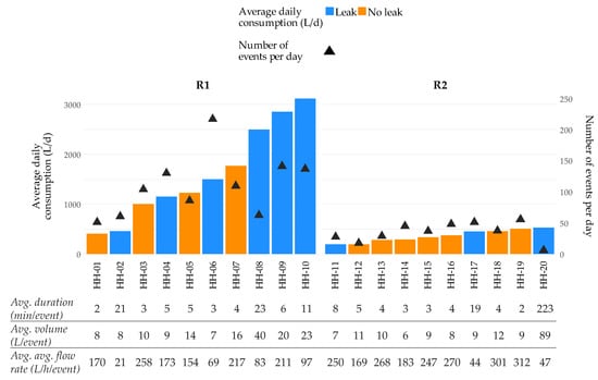 For this analysis, a selection of significant households of both studies was conducted according to the average daily consumption and the presence or not of continuous leakage. The final selected sample was composed by 20 households—10 from R1 and 10 from R2—for which two-week period of monitoring data were selected. For the first study, the data corresponds to consumption made during autumn 2015, while for the second study the data were collected during autumn 2016. In total 19,858 sampled events were analyzed during the period considered. Figure 7 shows the general characteristics of the selected households and events associated with them.