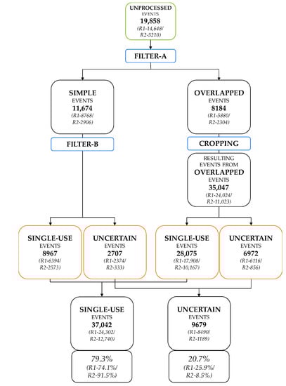 Overall, the methodology generated a number of single-use events equal to 37,042 events (79.3% of the 46,721 resulting events), of which 75.8% has been obtained through the proposed disaggregation process. Consequently, human intervention to crop and generate single-use events has been significantly minimized, with subsequently large human working time savings. In raw numbers, the total automatic disaggregation process has taken less than 4 days (96 computing hours); whereas, according to the authors’ experience, the same work would have required about 45 human-working days (360 h).
