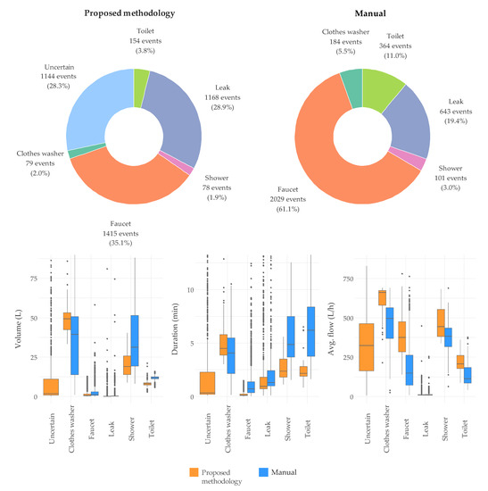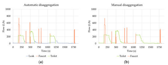 Figure 11 shows the final results after assigning a water end use to each cluster for the household under study. Given the same monitoring period, the outcome of proposed methodology is compared with the one obtained manually. It can be observed that the physical characteristics of the events in each end use category tend to be similar. Nevertheless, there is a significant deviation, especially with respect to the mean flow rate and duration of the events: the average flow rate for each end use tends to be higher in the presented approach, while the average duration is generally shorter as more cropping operations are conducted through the automatic disaggregation process. In addition, both parameters—volume and duration of single-use events—are less dispersed when the flow traces are automatically cropped. This is directly related to the inherent defects of manual editing that can be seen in Figure 12 (additional examples in Appendix B): the automatic algorithms recognize the leakage event by means of a volume check (Figure 12b), whereas the analyst has subjectively decided in this specific case to ignore it (Figure 12a) and add the volume to the toilet use. When a human analyst processes the consumption data, the resulting average duration of faucets and toilets is larger and the average flow rate smaller. Additionally, for the same reason, a greater number of leakage events have been identified and separated from other consumption through the proposed methodology. These findings demonstrate that automatic disaggregation tools can generate a standardized corpus of processed data, which is more homogeneous and reliable because it is obtained as a result of cropping operations based on solid and well established criteria. Therefore, the single-use events obtained from the automatic disaggregation algorithms developed in this study are significantly more reliable, in terms of duration, average flow rate and shape than those resulting from a manual processing and cropping the water consumption flow traces. These results have direct implications in the probability functions used to characterize water consumption events frequency, duration and intensity [30,31,32,33,34].