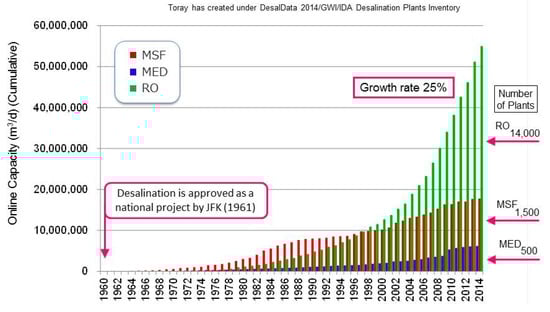Seawater desalination went into operation in the 1960s as national research of the United States, and the distillation process became commonly used in actual plants in the 1970s. However, since 2000, the energy saving reverse osmosis membrane process has surpassed the distillation process and has rapidly spread as plants have become bigger, as shown in Figure 1 (produced by the authors based on data) [1]. The Online Cumulative Capacity (m3/day) of RO is higher than that of MSF and MED. The growth rate of RO is also very high compared with that of MSF and MED. The cumulative number of MSF, MED and RO plants is increasing. The large number of RO plants means the average size of RO plants are still small compared with MSF and MED.