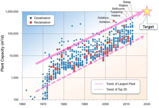Considering the increase in the population and economic development, the desalination market is growing rapidly (Figure 1). The size of desalination plants is increasing, and ultra large plants handling mega-tons per day (1,000,000 m3/day) will be required by 2020 [2], as shown in Figure 2. To solve the global water shortage problem, plants have been using the reverse osmosis membrane process, which has been rapidly spreading in recent years, since around 1970. After that, enlargement of the plant scale has progressed, and, since 2000, they have grown to exceed 100,000 m3/day (corresponding to the amount of water necessary for about 400,000 people on average in developed countries).