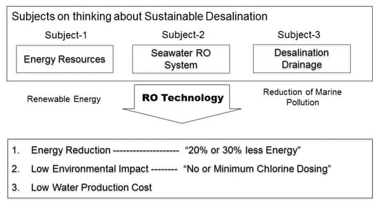 The relationship between the Theme and Mission in Table 1 become very clear. Energy saving is related to Themes 1, 2 and 4. Low environmental Impact is related to Themes 1, 2, 4 and 6. Low water production cost is related to Themes 1–6. Plant operation reliability is related to Themes 2, 3, 5 and 6. Especially, low water production cost is very a complex matter to discuss generally. Thus, the “Mega-ton Water System” project has been involved in cost reduction using advanced technology. The authors do not discuss each plant; instead, plant size, operating pressure reductions, energy recovery increase by new generation ERD, the optimized SWRO system by LMS, energy recovery by PRO, high durability high pressure resin pipe, and less chemical by no chlorine and sodium bisulfite are included. It was very difficult to cite the cost comparison done by others in the last years because the premise of cost condition is very different, even though we have many announcements.