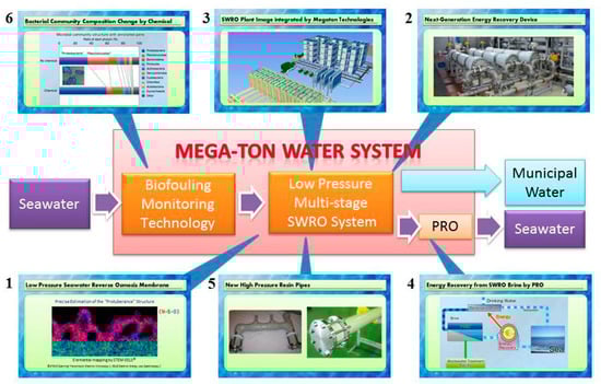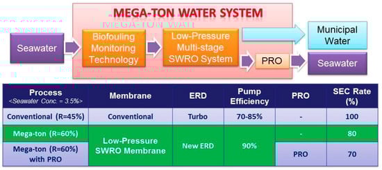 Reverse osmosis (RO) membranes have been widely applied in seawater desalination (SWRO) and wastewater reclamation as the main desalination technology since 2000. SWRO plants face challenges to reduce energy consumption and brine disposal to lessen marine pollution. To tackle these challenges, a SWRO-PRO (Pressure Retarded Osmosis) System was proposed in the “Mega-ton Water System” project under the Japanese national project of the “Funding Program for World-Leading Innovative R&D on Science and Technology” (FIRST Program). To reduce the energy consumption of the main SWRO plant, an innovative low-pressure SWRO membrane and a next generation energy recovery device (ERD) were developed by the “Mega-ton Water System” project. In addition to this research and development, a new membrane process has been proposed and confirmed as a low-pressure multi-stage SWRO (LMS). A brine conversion two-stage SWRO system was invented 20 years ago, and has been in operation for over 15 years. Application of the SWRO membrane process to actual commercial plants was an important research theme. The low-pressure multi-stage SWRO System (LMS) was an innovative method of introducing a low-pressure membrane and the membrane element in the pressure vessel was designed to avoid heavy fouling of lead elements. As a result of these developments at mega-ton scale SWRO plants, a 20% energy reduction was possible in the SWRO system of the “Mega-ton Water System”. In the development of the PRO process, a PRO hollow fiber membrane module with a maximum 13.3 w/m2 of membrane power density using a 10-inch module was established at a prototype PRO plant. Thus, a 30% energy reduction was possible using the SWRO-PRO System in the “Mega-ton Water System” at mega-ton scale SWRO plants. The brine disposal problem was also solved by this system.