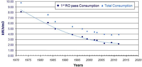 Although Miguel Sanz has reported the historical trends of the energy consumption of the total plant and the 1st RO pass, as shown in Figure 5 [8], in the “Mega-ton Water System” project, the target value of energy consumption as total plant under TDS 35,000 mg/L seawater concentration was set to 3.00 kW·h/m3 or less. In this case, it is possible to reduce energy by 20% compared with the conventional system.