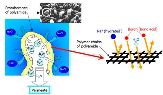 Although the ideal crosslinked fully aromatic polyamide SWRO membrane should have both high water permeability and high solute removal performance, there is usually a trade-off between increased water permeability and decreased solute rejection rate. However, when a pore in an RO membrane, which is a space within polymers, is assumed, the performance of the RO membrane must be controlled by size and quantity. Namely, solutes in the water are excluded by pore size, and the water permeability depends on the quantity of pores. To enhance performance, scientific research on the molecular structure and solute transport mechanism in an RO membrane is necessary. Schematic diagram of water permeation through the protuberance of the RO membrane is shown in Figure 6 [5,6,7].