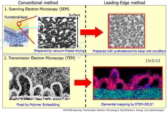 By applying the new pretreatment method and adding technology for evaluating basic analysis of the RO membrane structure using a transmission electron microscope (TEM) (conventional process (Figure 7) (lower left)), it has become possible to perform mapping analysis on nitrogen atoms derived from polyamide membranes. This has made it possible to clarify that the surface of the fold structure is a true polyamide layer (Figure 7) (lower right) [5,6,7,9].
