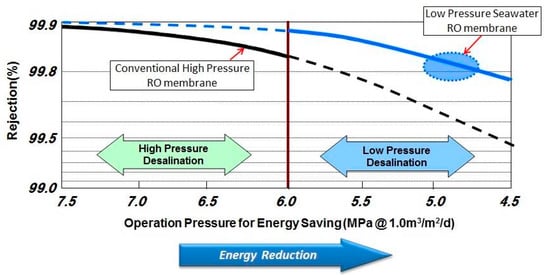 The operation pressure for obtaining the same permeation flux and the same salt removal rate is higher than 6 MPa in conventional high-pressure desalination. However, the low-pressure desalination in this research makes it possible to lower the pressure to 5 MPa, thus greatly contributing to energy saving (Figure 8).