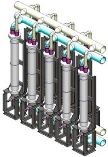 Therefore, as shown in Table 2, while the conventional isobaric-type ERD required 6–7% extra energy compared to the ideal ERD, this method made it possible to reduce the extra energy consumption by 2.5%. An installation image of ERD in the “Mega-ton Water System” is shown in Figure 10 [11].