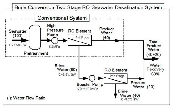 A low-cost seawater desalination system called the Brine Conversion System (BCS) was developed 20 years ago by the author’s group [12], as shown in Figure 11, which provides a 60% recovery rate. The concentrated seawater (5.8% of salt concentration) from the first stage RO modules is pressurized to 8–10 MPa by a pressure booster, then the concentrate is supplied to the second stage RO modules. Additional fresh water is obtained from the second stage, and the feed water is finally concentrated to approximately 8.7% salt concentration. A 60% recovery rate in total can be obtained, of which 40% comes from the first stage and a further 20% comes from the second stage.