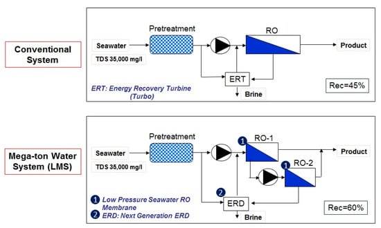 Comparison of flow diagram for conventional Seawater Reverse Osmosis (SWRO) system and “Mega-ton Water System” (Low Pressure Multi-Stage System (LMS)).