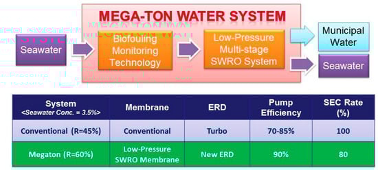 - The “Mega-ton Water System” project in Japan is an example of SWRO-treated waste water:Case (1) is now suspended due to the poor membrane performance: failed to reach the target [19].Case (2) [22,23].