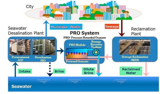 - Kurihara, M.; Sakai, H.; Tanioka, A.; Tomioka, H. Role of pressure-retarded osmosis (PRO) in the mega-ton water project. Desalin. Water Treat. 2016, 57, 26518–26528. [Google Scholar] [CrossRef]