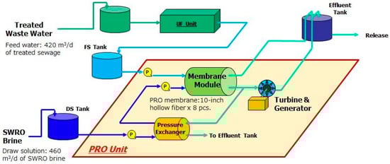 In this research, this PRO technology (system) is to be added to the seawater desalination system according to the environmental needs, and the overall flow is shown in Figure 14 [22].