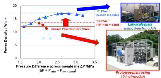 The prototype plant achieved 13.3 W/m2 of the maximum membrane power density per surface area using 10-inch membrane modules. On the other hand, the lab-scale plant showed 17.1 W/m2 with a five-inch module, as shown in Figure 16 [22,23,24].