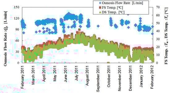 Long-term test operations at the PRO prototype plant were carried out over one year, as shown in Figure 17. The osmotic flow rate through the membrane was found to depend on the temperature, which varied seasonally as with conventional membranes. There was a slight decline in the osmosis flow rate between the beginning and one year after the test launch, even though it continued to use the same membrane modules. This means that we successfully produced fresh water from the treated waste water of sufficient quality for the PRO system, employing a conventional pre-treatment method and judged that commercial scale operation would be possible for long periods.