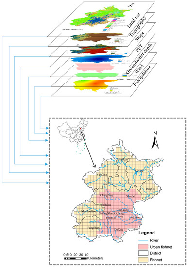 The research was conducted at city scale and quadrat scale, respectively. At quadrat scale, the continuous quadrats of 5 km × 5 km were delineated by ArcGIS to identify the correlations between impervious surface landscape patterns, and water balance at the quadrat scale. Totally, there are 5695 km × 5 km quadrats in the whole study area and only 201 quadrats in urban area of Beijing. The fishnet map is shown in Figure 1. In each quadrat, the average value of impervious percentages and different landscape pattern indices were calculated by zonal statistics in ArcGIS.