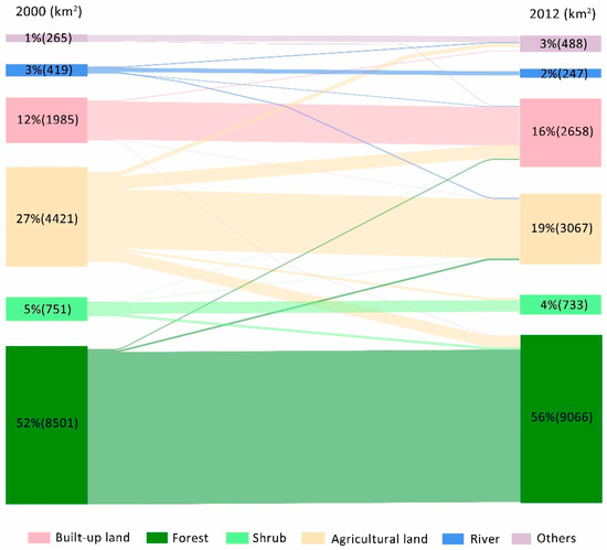 The comparison of two periods for land uses is shown in Figure 2. Overall, forests were widely distributed in the north and southwest parts and agricultural lands were relatively scattered. Grassland is mainly alpine meadow and distributed in the mountainous area. The proportion of bare land is very small and scattered. Built-up lands are in the center and southern part. Moreover, the built-ups areas increased and decentralized from 2000 to 2012. The transformed areas for each land-use type between 2000 and 2012 are presented in Figure 3.