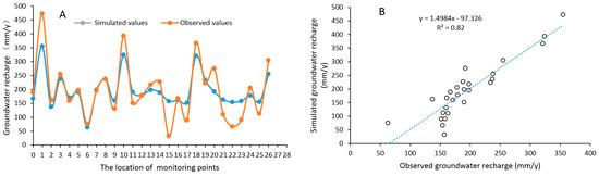 Evaluation of simulated and measured groundwater recharge: (A) the simulated values and observed values of groundwater recharge in 2012 for 27 monitoring points; and (B) the linear relationship between simulated and observed groundwater recharge.