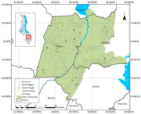 Our primary data collection occurred via two activities within a larger project evaluating the impact of different incentive structures [24] on the adoption of the three practices of conservation agriculture in the Shire River Basin, Malawi. This larger project includes a random sample of 63 villages selected from the pooled sampling frame of the 5 extension planning areas (EPAs) riparian to the upper Shire River Basin, including Balaka and Machinga districts and a portion of Zomba district (Figure 1). The work presented in the current paper does not draw on distinctions across treatments, and rather focuses on the aggregate effect of having been offered an incentive or not, but the interested reader is directed to [25] or to Appendix A for further details on project design. The two activities whose data we draw on in the current study include a small-n ethnographic exercise (n = 96 respondents) conducted in a selection of project villages between the end of the intervention and the endline study, as well as a survey module within the project’s endline study (n = 1923 respondents).