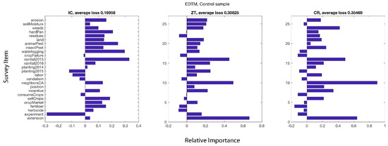 Relative variable importance in predicting intercropping (IC), zero tillage (ZT), or crop residue mulching (CR) within the Control sample from the EDTM module, based on change in OOB prediction error across a forest of trained classification trees. Variables ordered as in Table 1.