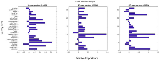 We used the TreeBagger package in Matlab’s Machine Learning Toolbox to train a “forest” of 100 classification trees to predict farmers’ adoption of each of the three CA practices using data from the EDTM module, separately for both (i) responses from respondents in control villages (hereafter, “control”) and (ii) responses from respondents in treatment villages (hereafter, “treatment”). Each forest is generated using 10-fold cross validation, meaning that the available data are sliced into 10 parts, with a part excluded from a set of trees trained on the remaining nine parts, and repeated 10 times. The trained trees are then validated on the excluded part, generating an estimate of “out of bag” (OOB) prediction error. TreeBagger also generates an estimate of predictor importance, by estimating the relative OOB prediction error when individual predictors are excluded from the trees. To compare the predictive capacity of the EDTM module with that of other survey modules common to household surveys, we incorporated other modules from the endline survey (treatment characteristics, household characteristics, neighborhood characteristics, farm characteristics, and risk perceptions; a list of included items as well as our complete Android ODK protocol is attached as supplementary information) and repeated the above TreeBagger exercise, giving us estimates of predictor importance as well as average prediction error for forests of trees (and predictors within them) built from pooling the EDTM module with these additional modules.