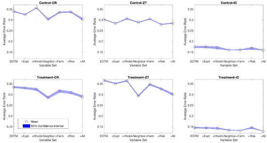 Prediction error is reduced in most cases by inclusion of neighborhood characteristics; inclusion of risk variables offers some improvement to explaining crop residue mulching and zero tillage in the treatment group; inclusion of farm characteristics improves prediction of IC in both the treatment and control groups. It is notable that the module with the greatest additional impact on prediction, neighborhood characteristics, is captured coarsely by the EDTM module (“Do any of your neighbors practice …”); and it is possible that more detailed probing of this topic in the interviews may have yielded additional criteria to capture the variability explained by the neighborhood module. Additional points to draw from Figure 4, reinforcing the message from other results in this study are that (i) the prediction of intercropping and the factors that improve prediction of intercropping are distinct from those which predict crop residue mulching and zero tillage and (ii) the factors that improve prediction in the treatment group appear to be different from those that improve prediction in the control group. Finally, it is noteworthy that in most cases, the reduction in prediction error with additional modules is modest, highlighting that the criteria outlined by farmers themselves were able to explain variability in adoption nearly as well as would the items in a larger household survey.