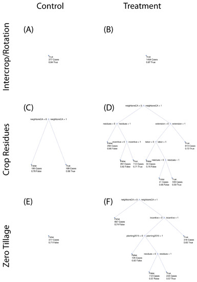 Decision trees for farmers’ choices to adopt treatment for intercropping, crop residue, and zero tillage in control (A,C,E) and payment (B,D,F) treatment groups.