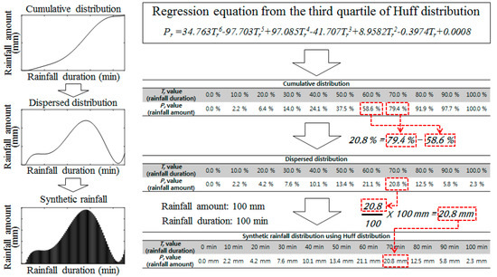 where Pr is the cumulative rainfall ratio, and Tr is the cumulative time ratio. The generation of synthetic rainfall data consists of three steps. First, the cumulative distribution per Huff distribution is generated according to the regression equations. Second, the cumulative distribution is converted to the dispersed distribution. Third, the amount of rainfall is applied to the dispersed distribution, and the synthetic rainfall event is obtained [16,17,18,19,20]. The type of regression equations for the Huff distribution is cumulative distribution. Figure 1 shows the generating process of synthetic rainfall data using the Huff distribution.